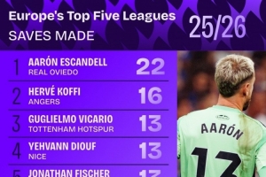 本赛季五大联赛扑救次数排名: